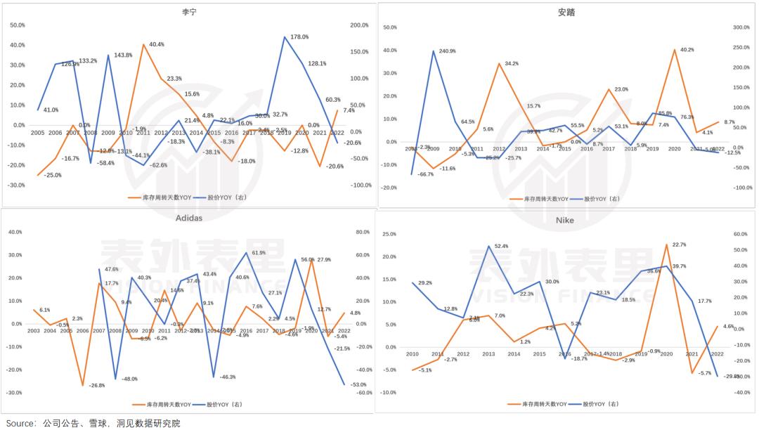 换言之,运服行业的库存危机,其实是一场场“周转革命”。其中库存效率(此处以存货周转天数变动幅度)与资本市场认可程度(股价涨幅)高度相关。