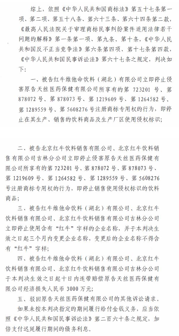 近日,快消君获取的《中华人民共和国吉林省高级人民法院民事判决书(2016)吉民初34号》(下称:《判决书》)显示,2022年10月31日,吉林高院就天丝公司针对红牛维他命饮料(湖北)有限公司(下称:红牛湖北公司)、北京红牛饮料销售有限公司、北京红牛饮料销售有限公司吉林分公司侵害红牛商标专用权及不正当竞争纠纷一案,做出一审判决: