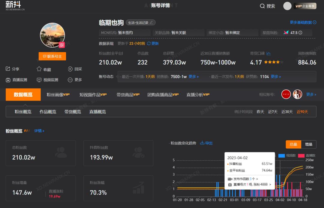 也狗在3月便马不停蹄地开启了直播带货,亲自下场做直播。新抖数据显示,“临期也狗”在3月13日场观仅有12万,随着账号粉丝暴涨,4月5日的场观最高超过了186万。