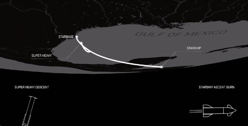 在原计划中,火箭发射后完成最初的爬升,然后将 Super Heavy 助推器投入墨西哥湾,星舰则独自飞越大西洋、非洲南端和印度洋,最后在夏威夷附近的太平洋降落。