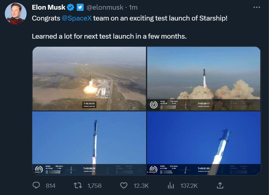 而且 SpaceX 仍然祝贺整个团队完成了激动人心的 Starship 首次综合飞行测试。