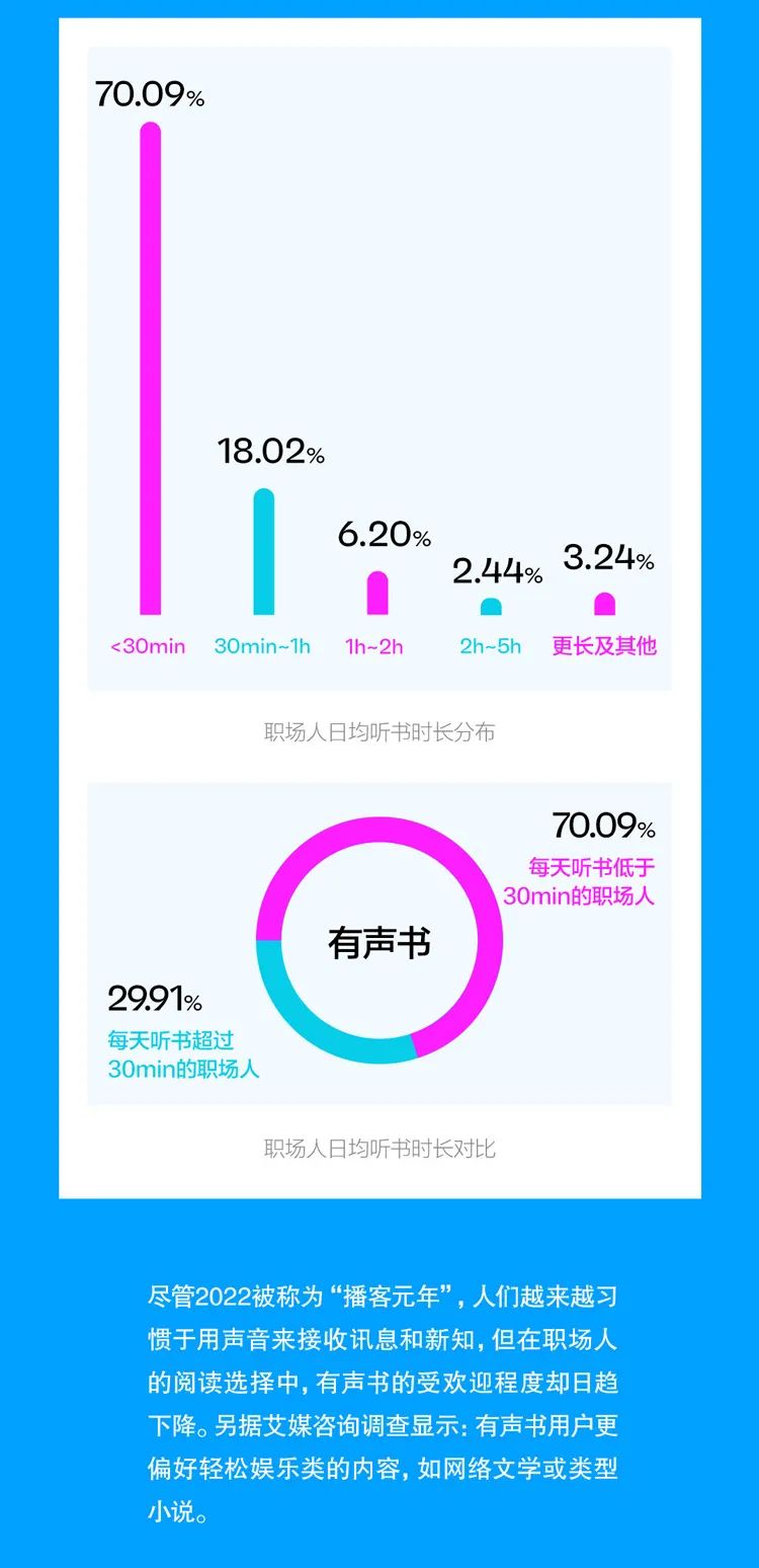 或许这就是为什么我们通过调查发现,尽管工作繁忙,有超过75%的职场人日均阅读时长高于半小时,近34%的职场人日均阅读时长高于1小时。