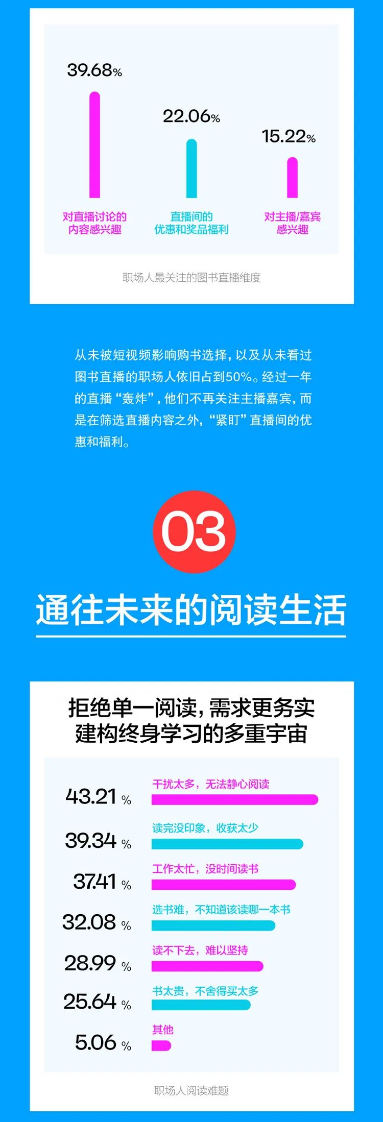 不过,随着短视频的流行,人们的阅读需求和习惯在近些年也受到了一定影响,人们的时间和注意力被吸引到更加短暂、碎片化的内容上,只关注标题和短暂的概述,而忽略了更加深入和详细的阅读和思考。