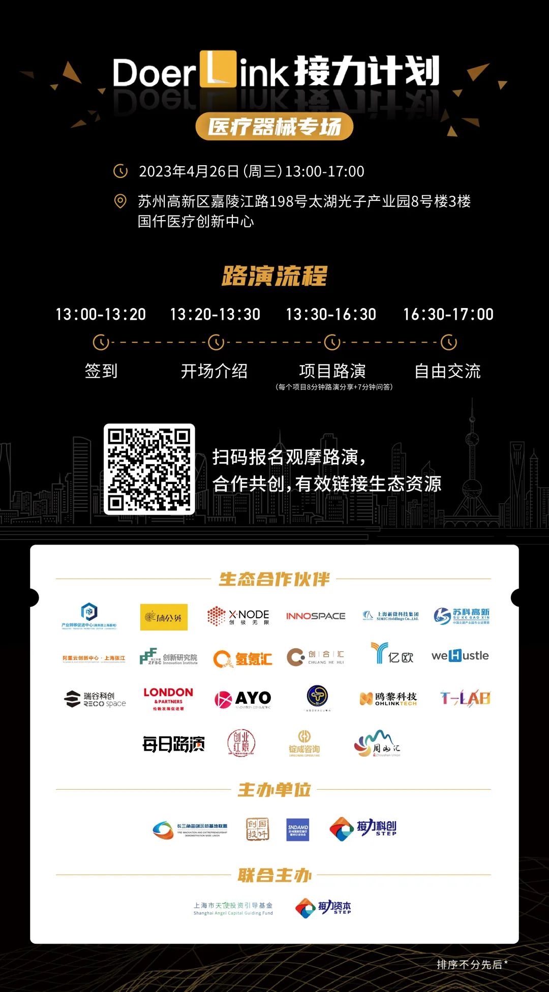 4月26日(周三),第二期「DoerLink 接力计划」将联合国仟创投、苏州高新区医疗器械行业协会,围绕医疗器械领域,邀请众多优质项目和专业投资人到场参与闭门路演,共同探讨创新研发痛点,分享最新研发成果,解析行业赛道动态与未来创新趋势。