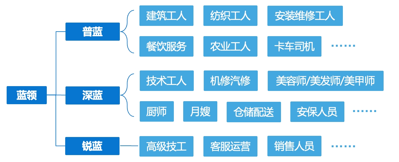 蓝领(Blue-collar worker)对应“白领”,是一个西方传来的工作形态定义,指大部分体力劳动工作及技术含量较低的办公室工作从业者。国内蓝领群体大体上可分为普蓝、深蓝和锐蓝三类。其中,深蓝与普蓝都偏重于体力工作,区别是深蓝较普蓝具有更高的技术含量与从业门槛;锐蓝工作地点大多为写字楼内,是蓝领与白领之间的过渡阶层,从职业路径来看最有可能实现向白领的转变。
