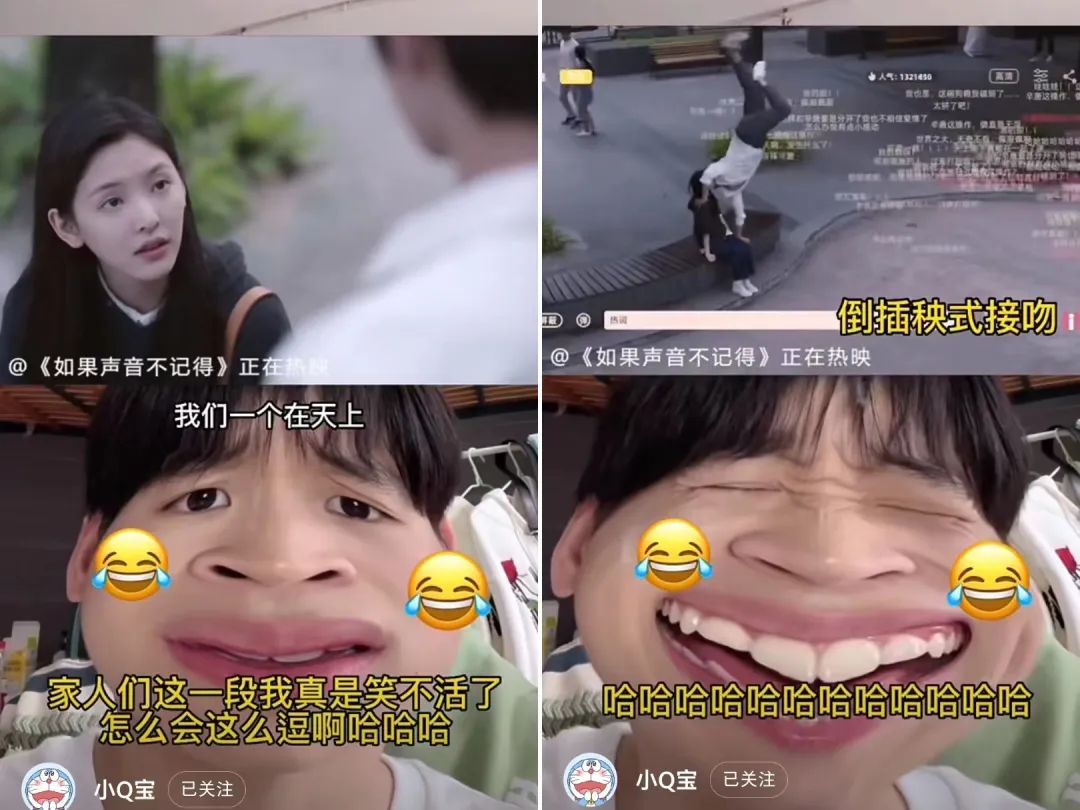 2022年11月,@小Q宝在小红书开始更新“离谱国产剧”系列视频,专门截取国产剧中的沙雕高能片段,并辅之以自己的实时reaction表演。首支视频笔记中,女主说着”我们一个在天上,一个在地上,怎么谈恋爱“的台词,男主则不紧不慢调转帽檐,在“前方高能”的字样下,他突然单手撑地,倒立与女主接吻,而视频下方博主的表情也从尴尬、目光闪躲变为刹不住的疯狂大笑,魔性的笑声、“流汗”与“大脸”特效与画面内容相得益彰。在戳中用户笑点后,这条笔记获得了2.7万次点赞。