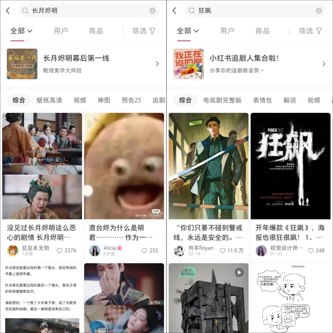 与此同时,小红书的娱乐板块也在走向丰富。在站内检索剧名,关键词下还包括壁纸、神图、剧情介绍、人物关系、经典语录等细分内容,从高光镜头到剧情走向、人物分析、CP磕糖等几乎一应俱全,即便是从未看到剧的人,在这番“剧透大潮”下也能对剧情片段略知一二。