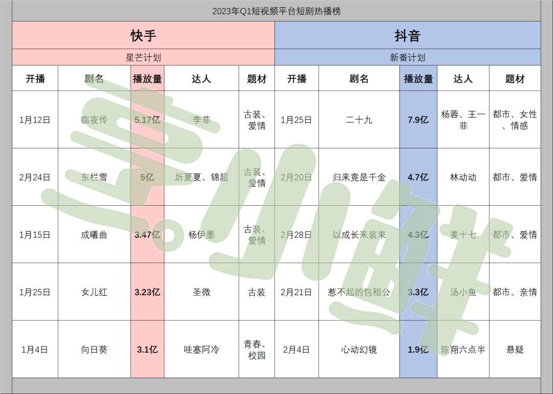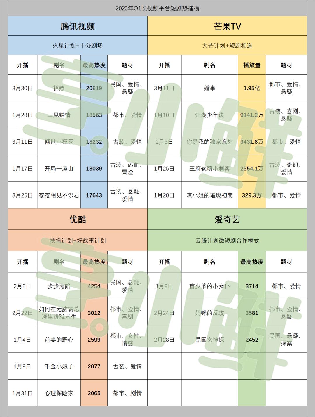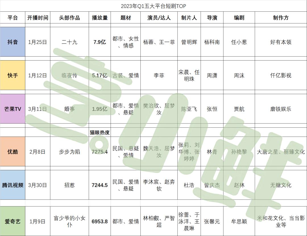 烹小鲜(pengxx01)继续【短剧鲜察】专题,增加新入局的爱奇艺、依据各平台前台数据,为各位读者带来2023年Q1六大视频平台TOP 5热播微短剧,旨在鼓励一季度表现优异创作者,并试图从中一窥新阶段微短剧行业发展态势。