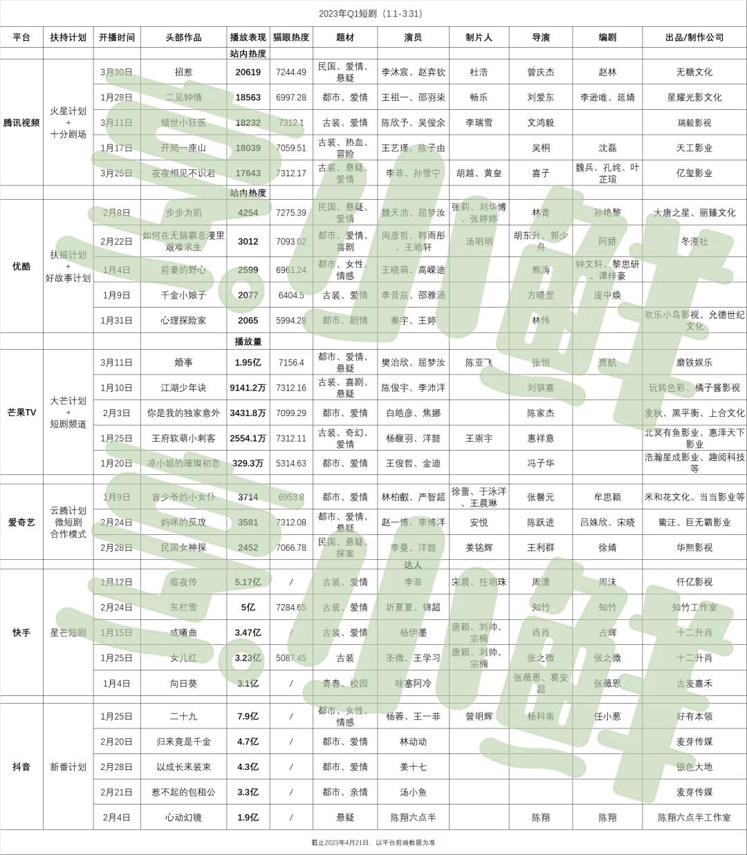 附表:六大视频平台Q1共28部TOP热播短剧及制作信息(不完全统计)