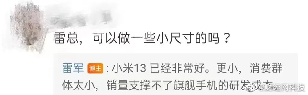 近日,有网友给小米创办人雷军留言,他想要更小尺寸的手机。对此,雷军表示:“更小屏幕的手机消费群体太小,销量支撑不了旗舰的研发成本。”(财经网科技)
