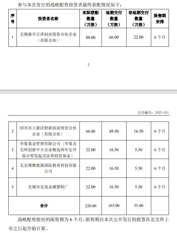在已完成缴款的战略配售环节,海达尔引入无锡惠开正泽创业投资合伙企业(有限合伙)、绍兴市上虞区财新创业投资合伙企业(有限合伙)以及华夏基金等5家战投。本次发行战略配售股份合计220万股,占本次发行规模的20%(不含超额配售部分股票数量),发行价格为10.25元/股,战略配售募集资金金额合计2255万元。