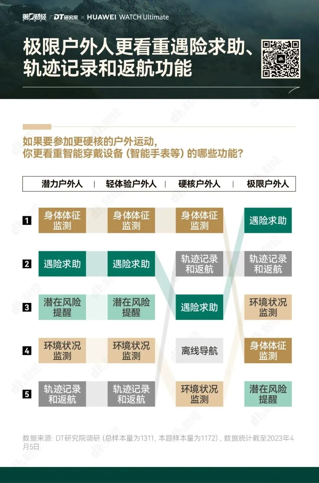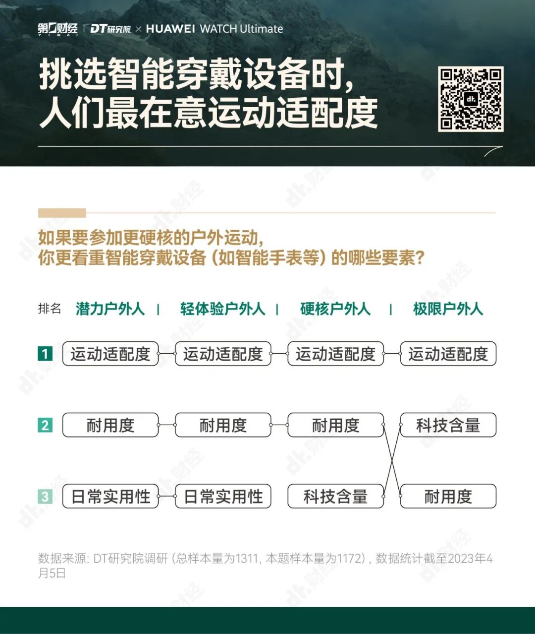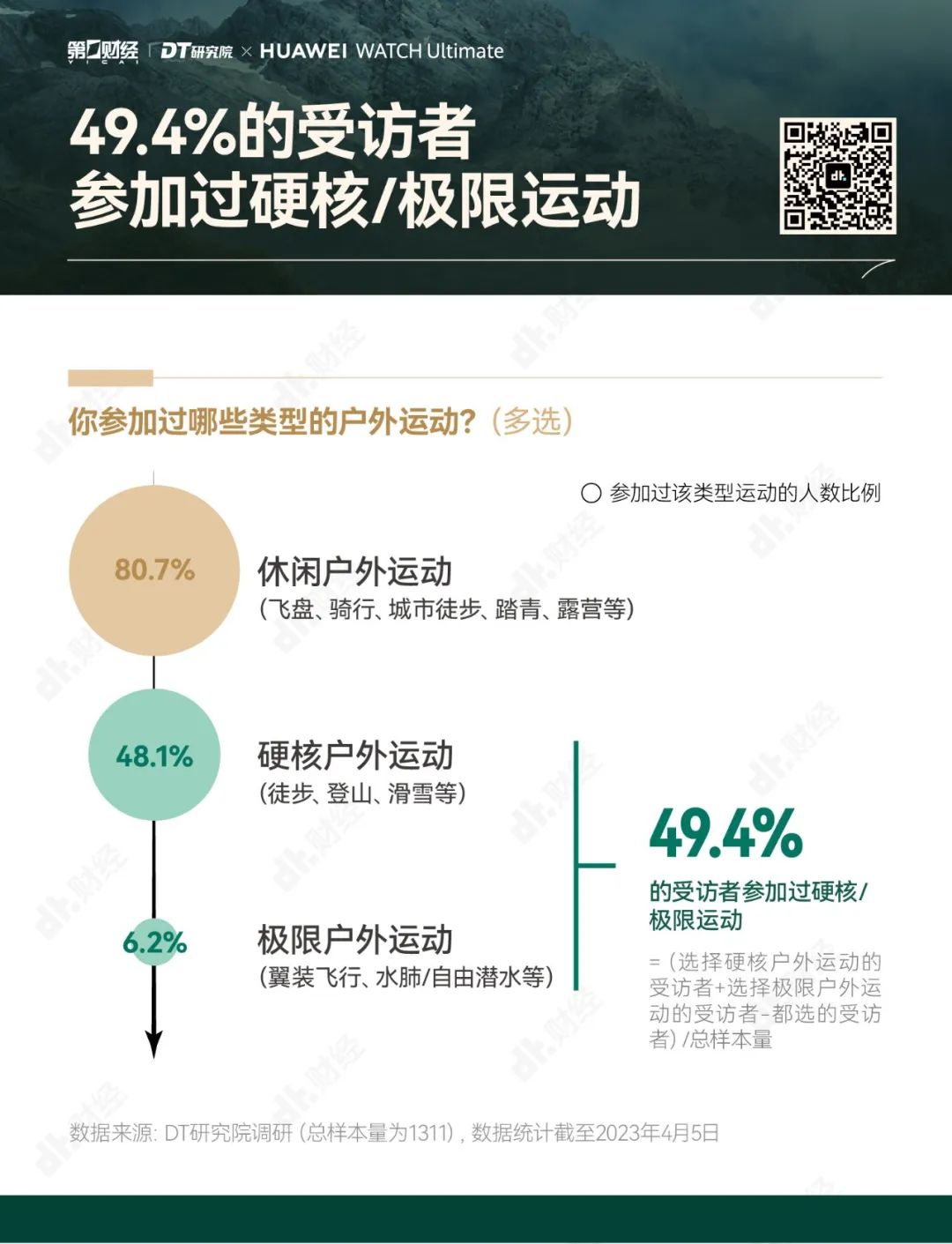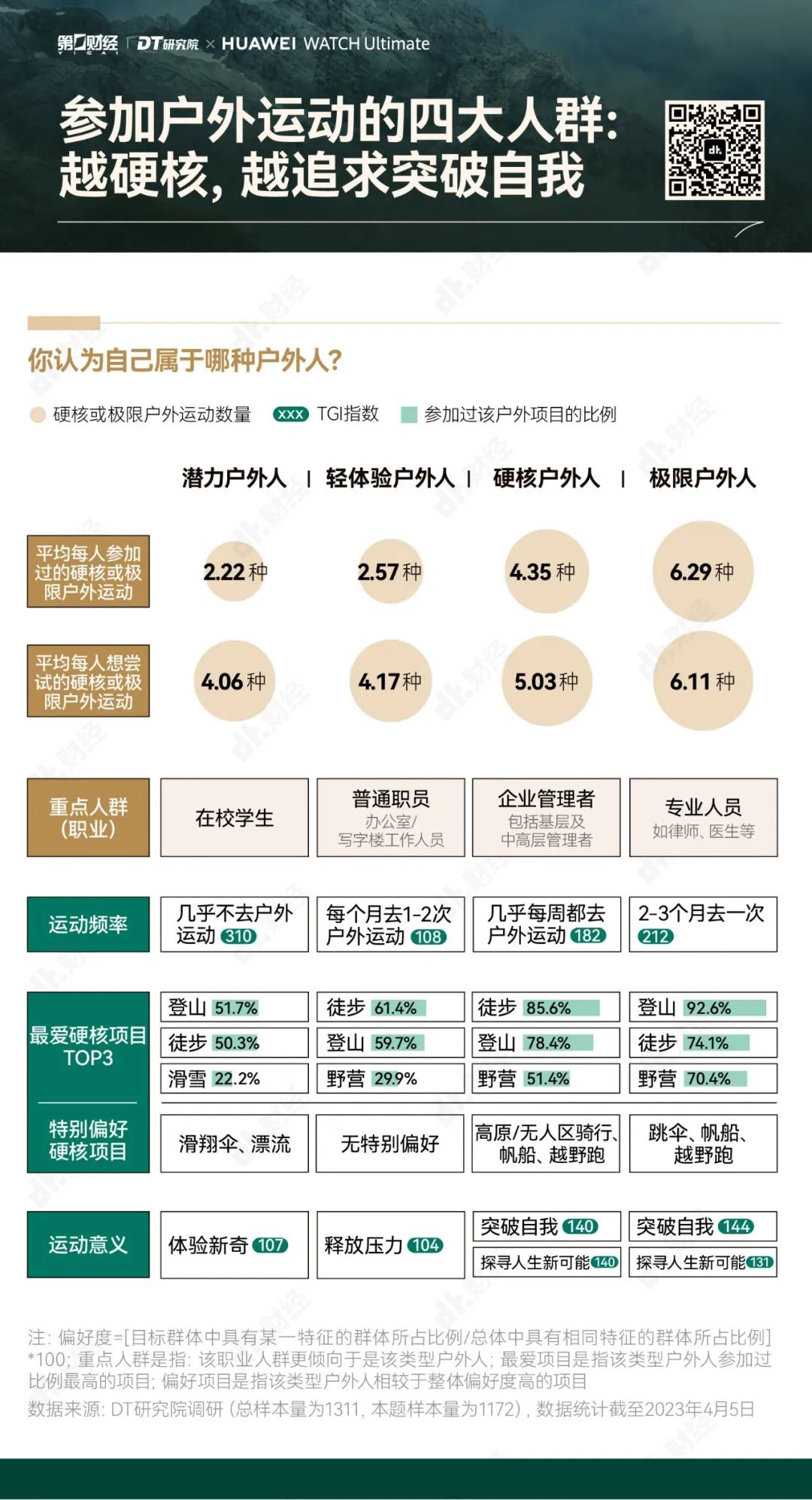 为了帮助大家更好地享受户外运动的乐趣,勇敢出发,安全回家,第一财经旗下DT研究院联合华为WATCH Ultimate 非凡大师推出《无畏前行:2023户外运动报告》,我们试图呈现的,不仅是“户外运动走向硬核”的洞察,也是一份有专业依托、有经验参考的户外运动指南。