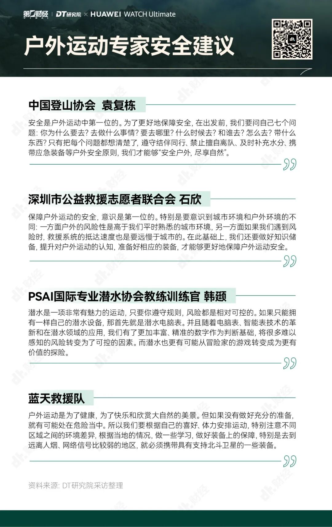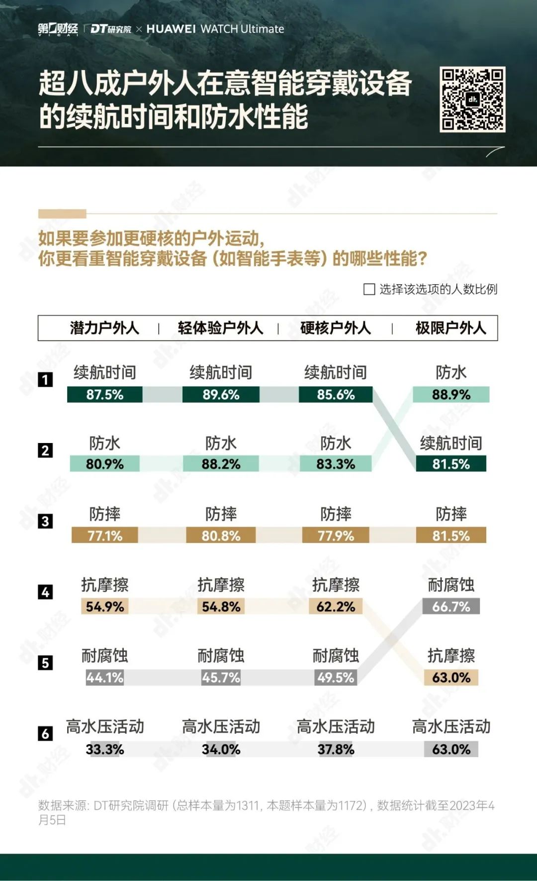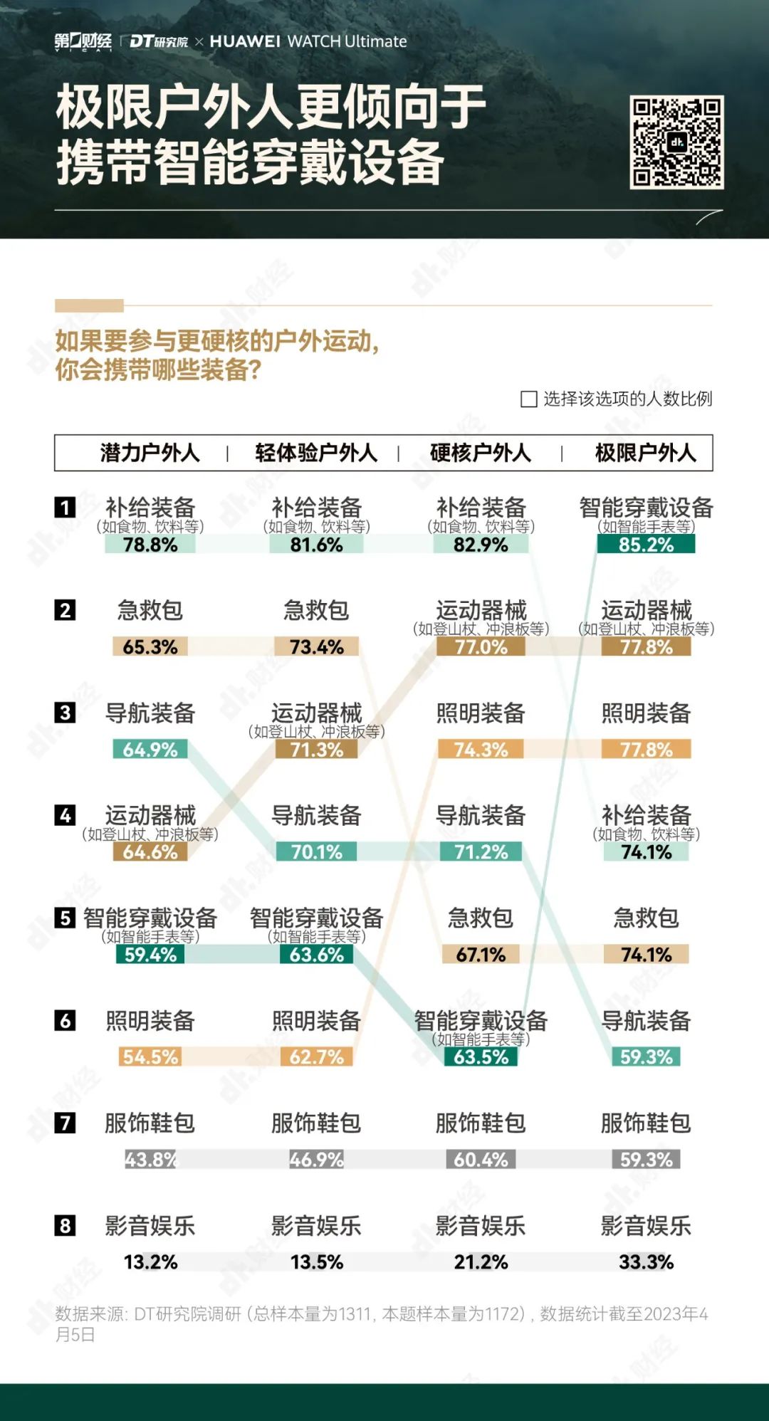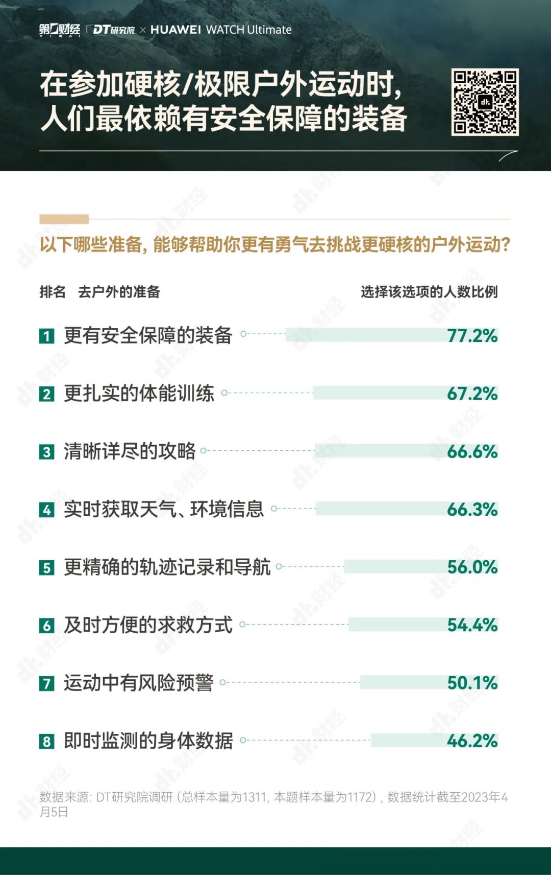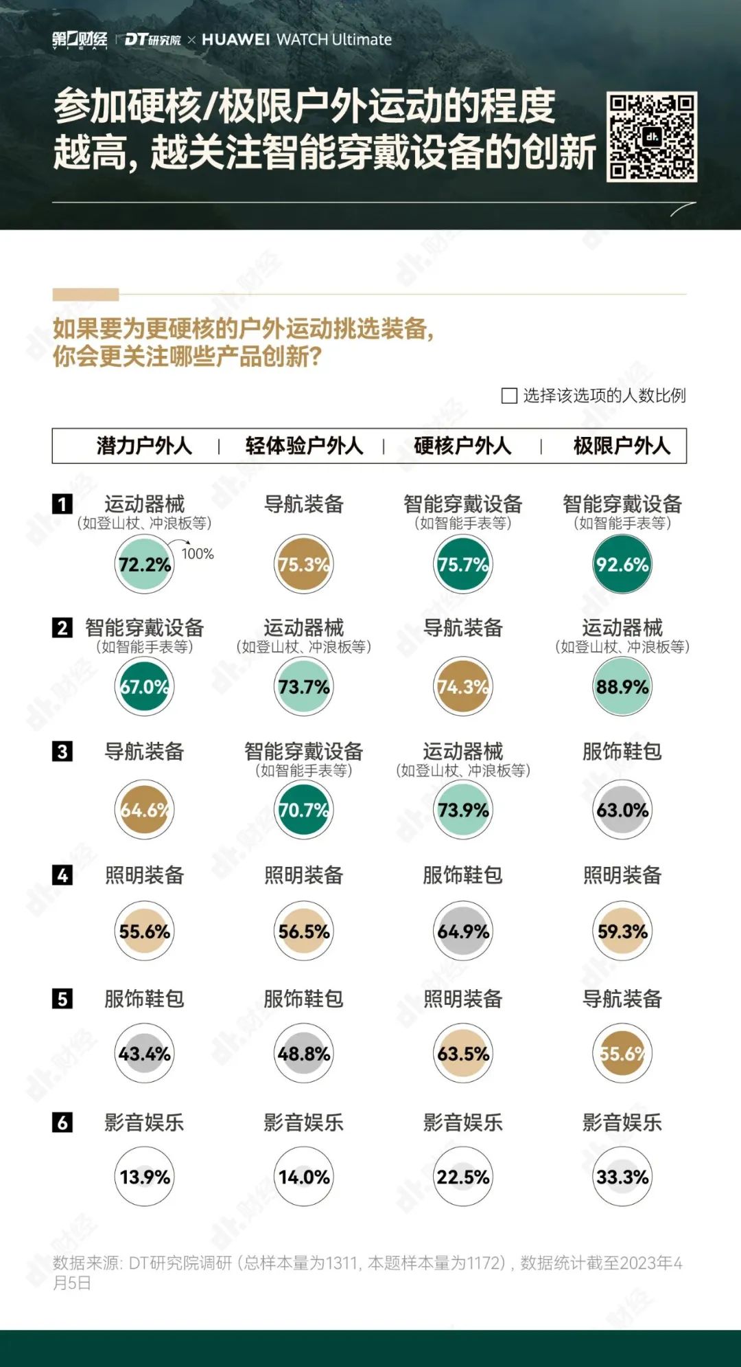为了帮助大家更好地享受户外运动的乐趣,勇敢出发,安全回家,第一财经旗下DT研究院联合华为WATCH Ultimate 非凡大师推出《无畏前行:2023户外运动报告》,我们试图呈现的,不仅是“户外运动走向硬核”的洞察,也是一份有专业依托、有经验参考的户外运动指南。