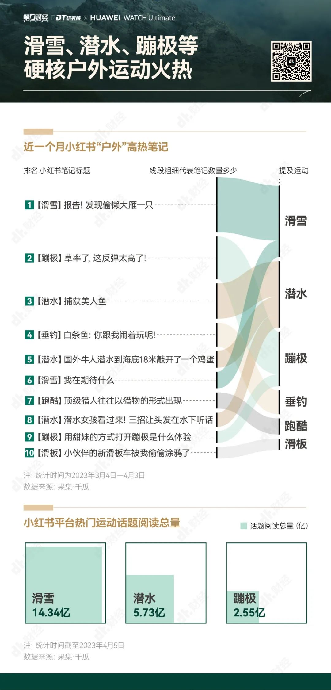 社交平台的声量也佐证了这股热潮。DT研究院统计了2023年4月典型社交平台上与“户外运动”相关的高热笔记,主题从滑雪、潜水到蹦极,大家提及的户外运动明显“硬核”。并且,这些笔记里提及的运动,例如滑雪、潜水和蹦极的话题总阅读量也分别达到了14.34亿、5.73亿和2.55亿。