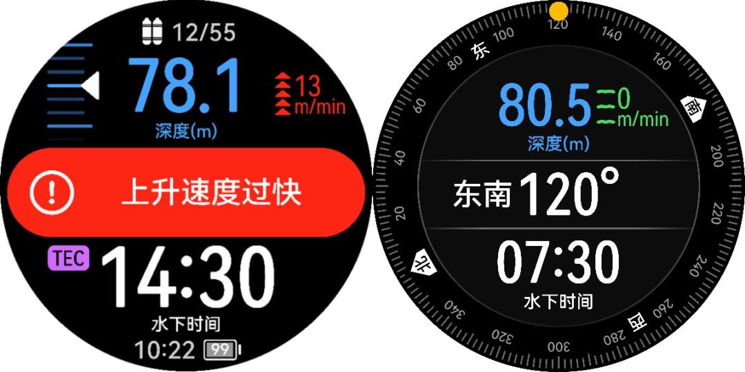 以华为WATCH Ultimate 非凡大师为例,在深水环境下,也能够提供深度、速度、水下时间等多个指标监测。并提供科学潜水减压指导。在上升速度过快、气体切换、减压停留等情形下,手表也会震动和发出蜂鸣提醒,避免发生水下意外。