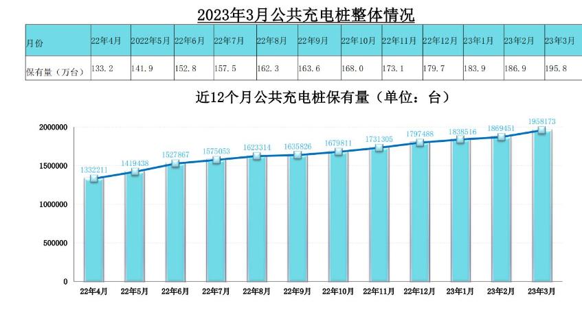 中国充电联盟发布的2023年3月全国电动汽车充换电基础设施运行情况中提到,2023年3月较2月公共充电桩增加8.9万台。截至2023年3月,联盟内成员单位总计上报公共充电桩195.8万台,其中直流充电桩82.2万台、交流充电桩113.6万台。从2022年4月到2023年3月,月均新增公共充电桩约6.1万台。