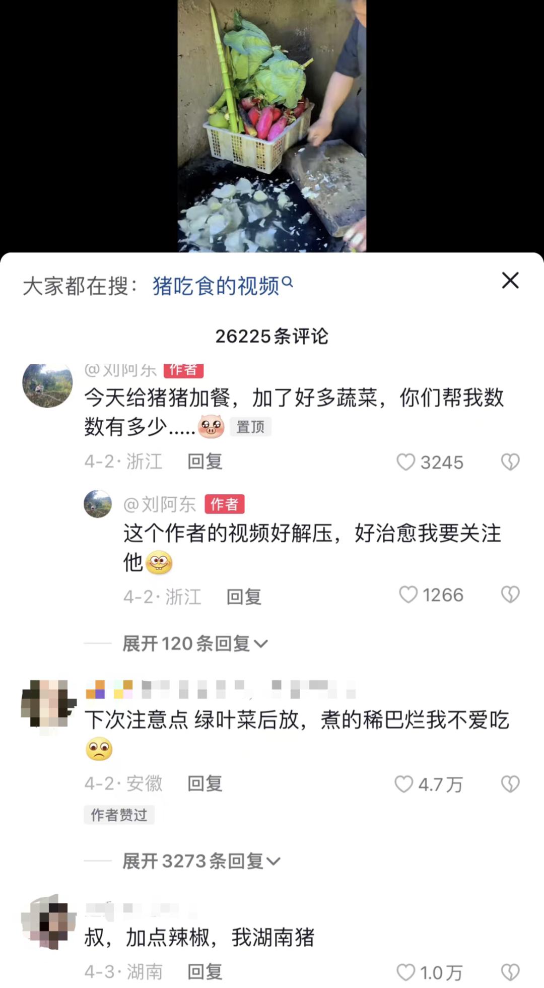 毕竟,猪吃的是现做的纯天然蔬菜,人往往得吃科技狠活满满的外卖预制菜。在评论区里假想自己是猪向博主点菜“我要吃苹果”,有种在以猪的第一视角玩养成游戏的感觉。