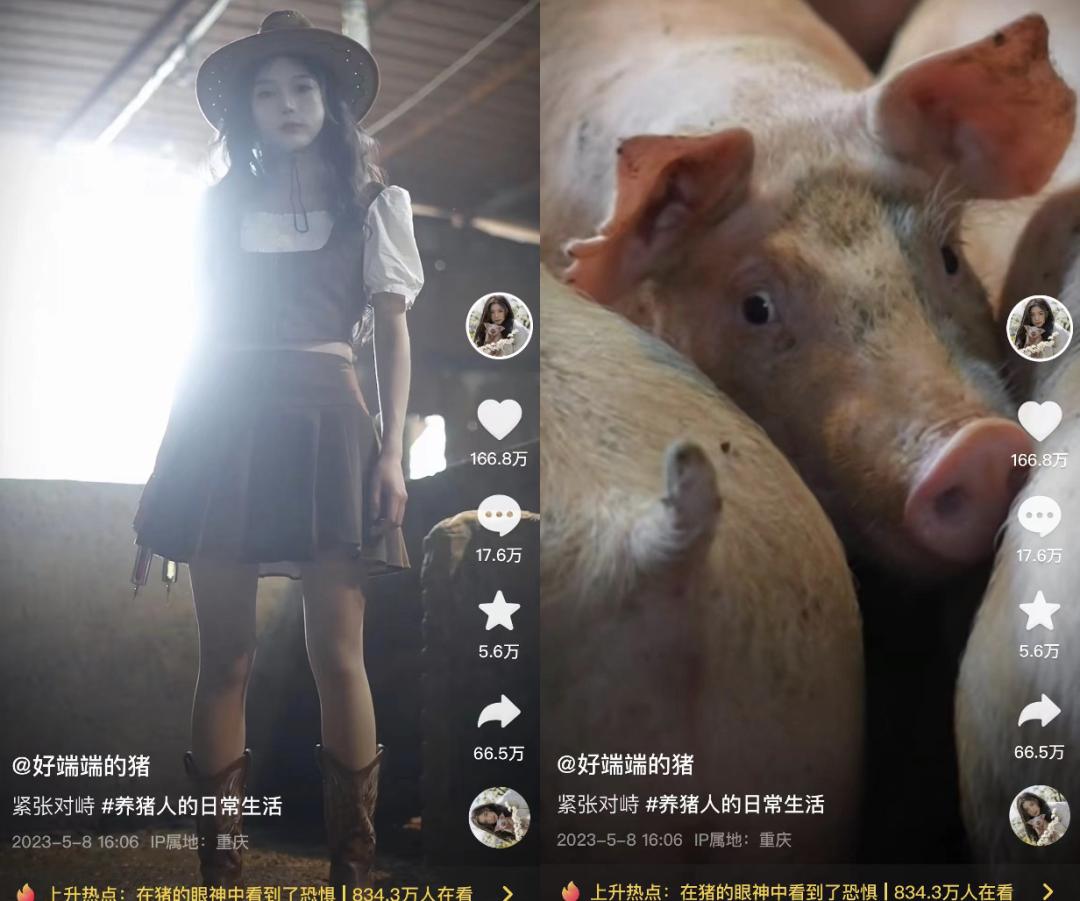四月底,这位博主登顶周涨粉榜,略略胜过唱“挖呀挖呀挖”的幼儿园黄老师。目前有爆款视频获超640万赞。她装扮成飒爽的西部牛(猪)仔女孩,卡着音乐用饲料铲把一个个探栏的猪鼻子打回去。一只又惧又饿的猪躲在角落,呆滞的眼神穿过洒下的饲料,想不透这个女魔头又要做什么。