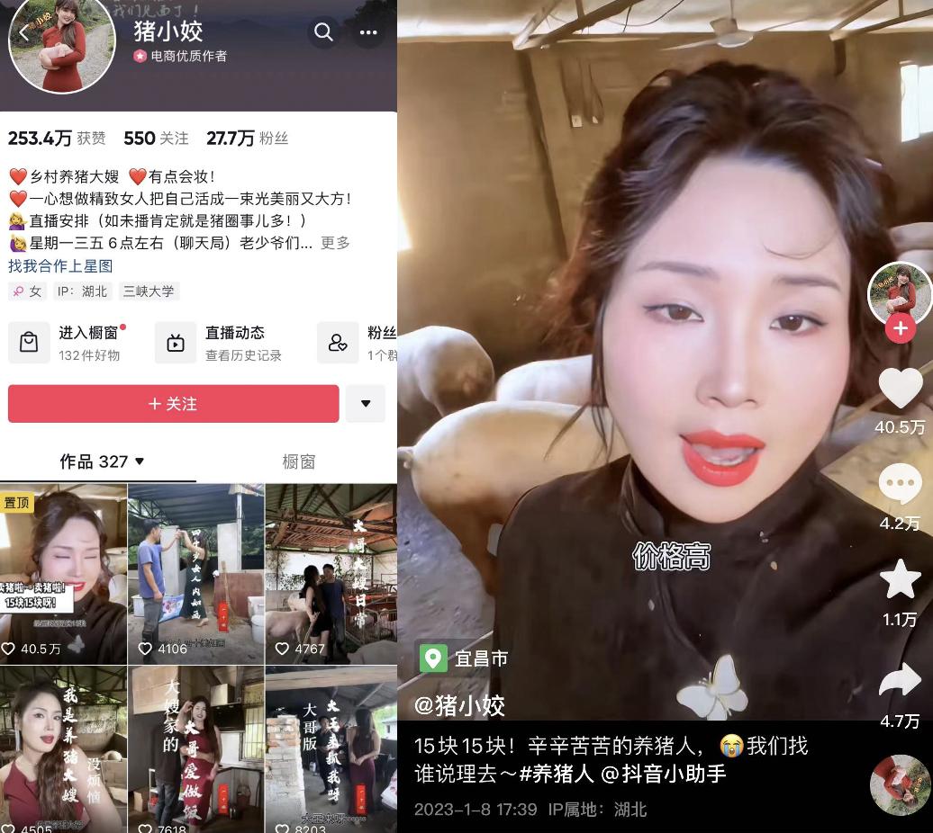 “好端端的猪”暂未直播和接广告变现,但她已经成了众多爆款分析号的卖课素材。同样依靠人设反差,比她红得稍早点的“养猪大嫂”猪小姣则通过直播带起了美妆和零食。