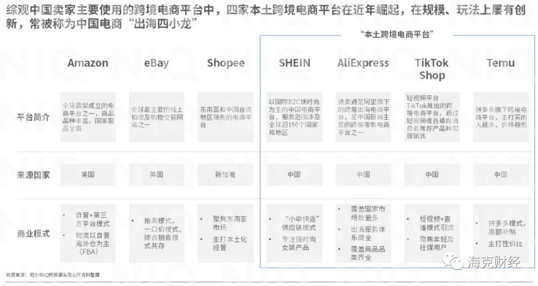近日,尼尔森发布《2023年中国跨境电商平台出海白皮书》,深度阐释了基于B2C模式的SHEIN、速卖通、Temu、TikTok Shop的各自优势。这四家平台如今常被业内称为中国电商“出海四小龙”。