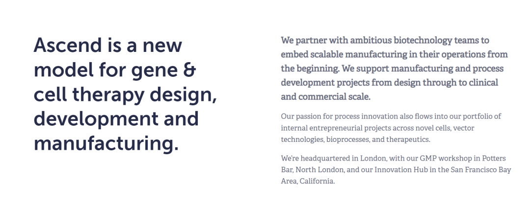 Ascend成立于2021年,由Monograph Capital孵化并提供1500万美元种子资金。作为一家专业的CDMO企业(合同开发和制造机构,Contract Development & Manufacturing Organization),Ascend致力于为先进治疗领域的生物技术公司提供工艺开发、临床生产、分析和合规等服务,以满足此类客户灵活的CMC需求(化学制造与控制,Chemical Manufacturing and Controls,包括药物合成、生产以及质量控制等)。