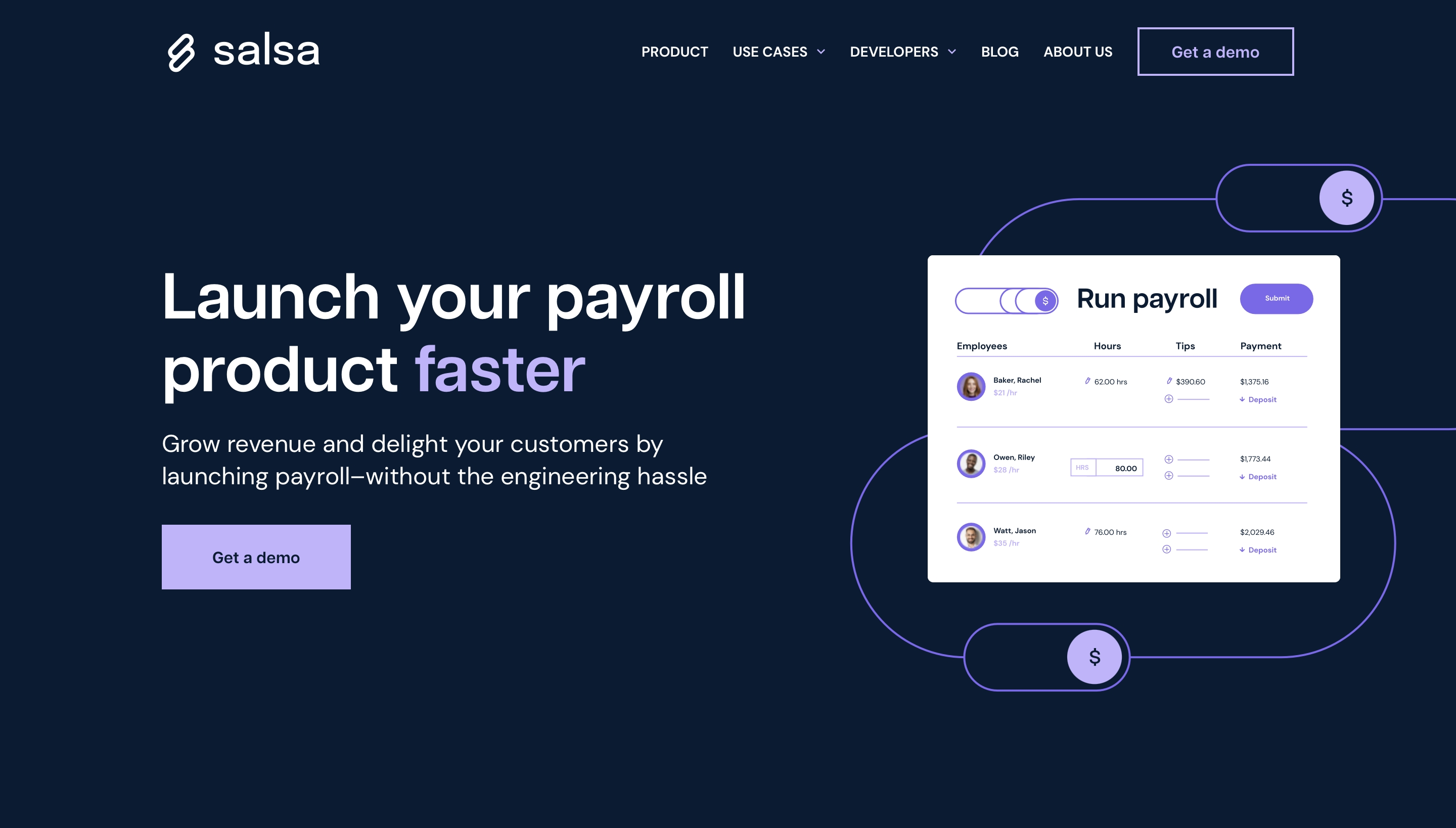 「Salsa」的目标客户是商业管理软件平台、新型银行、人事代理、劳工平台等,在美国和加拿大提供服务。该公司从软件公司所开发的薪资产品抽成,作为主要收入来源。