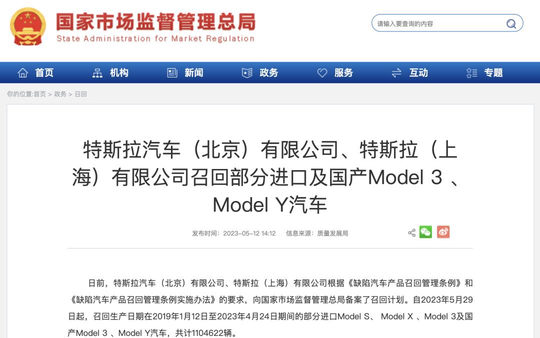在国家市场监督管理总局启动缺陷调查情况下,受调查影响,从5月29日起,特斯拉须召回生产日期在2019年1月12日至2023年4月24日期间的部分进口Model S、Model X、Model 3及国产Model 3、Model Y汽车,共计1104622辆,几乎覆盖了2019年至今,特斯拉在中国销售的全部车辆。