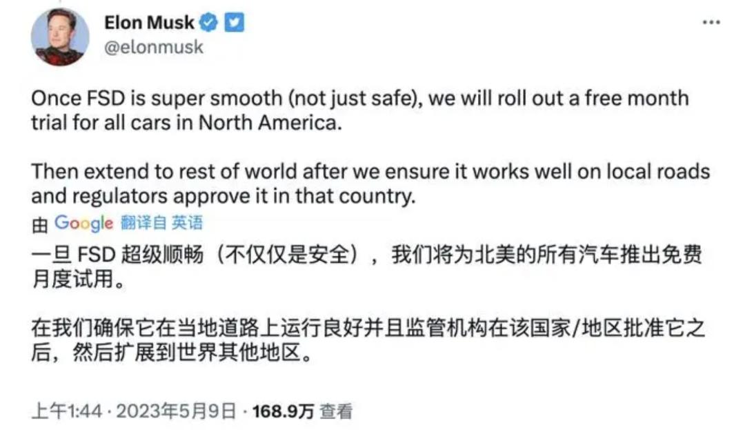 5月上旬,马斯克宣称要在北美和世界其他地区进一步推广FSD,并祭出了免费试用一个月的营销手段。