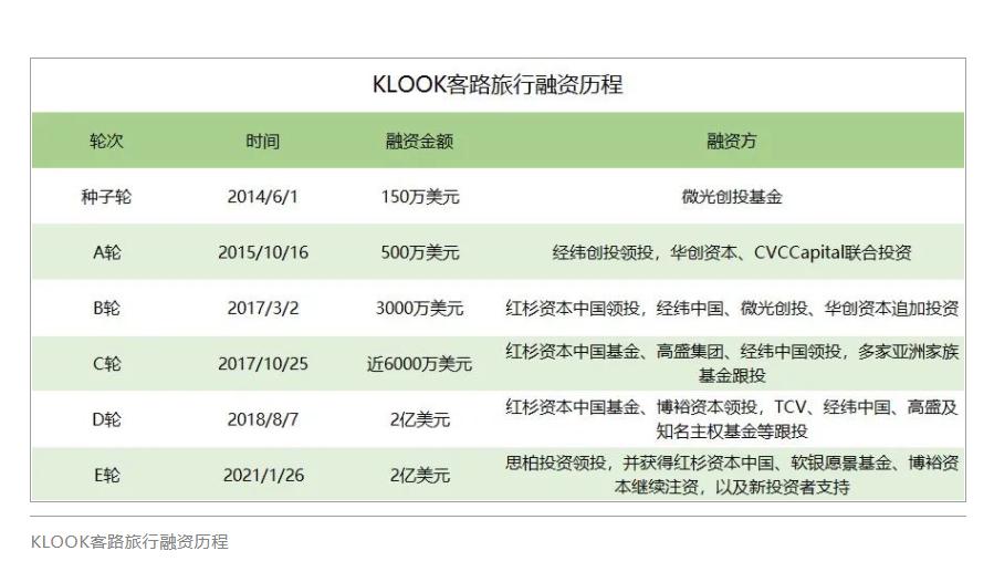 根据公开资料,KLOOK客路旅行至今已共获六轮融资。2015年6月1日,获得微光创投150万美元种子轮投资;2015年10月15日,获得经纬中国、微光创投500万美元A轮投资;2017年3月2日,获得红杉中国、经纬中国3000万美元B轮投资。由此,无论是在业务上、团队上还是资本市场上,Klook客路旅行均迎来了飞跃式发展。