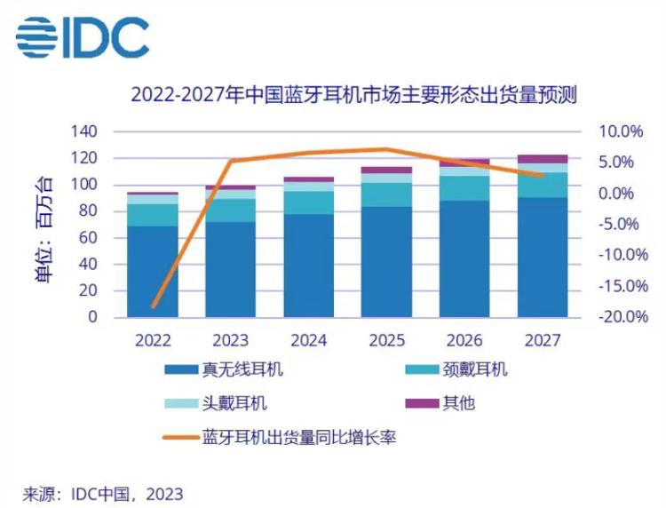 IDC发布的数据显示,2022年中国蓝牙耳机市场出货量约9471万台,其中,TWS出货量超过6881万台。IDC预测,随着TWS 耳机渗透率不断提升,市场逐渐呈现饱和状态,2023年TWS市场主要关注技术功能革新带来的发展机遇,预计出货量将呈现回升。