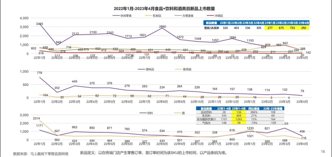 饮料新品上新方面,报告显示,2022年新品上市数量多,1-4月占全年新品数的40%左右,但到了23年,除乳制品和饮料外,其它品类推新力度大幅下降;2023年1-4月,乳制品、饮料类新品上市高于去年;运动饮料、乳饮料上新提升,气泡水新品数量同比大幅下滑74%。