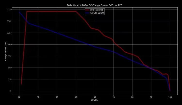 回到这批 Model Y。有人在当地汽车论坛上发布了一张试数据截图,显示新车在充电功率爬坡性能上比旧款车型高出了不少。