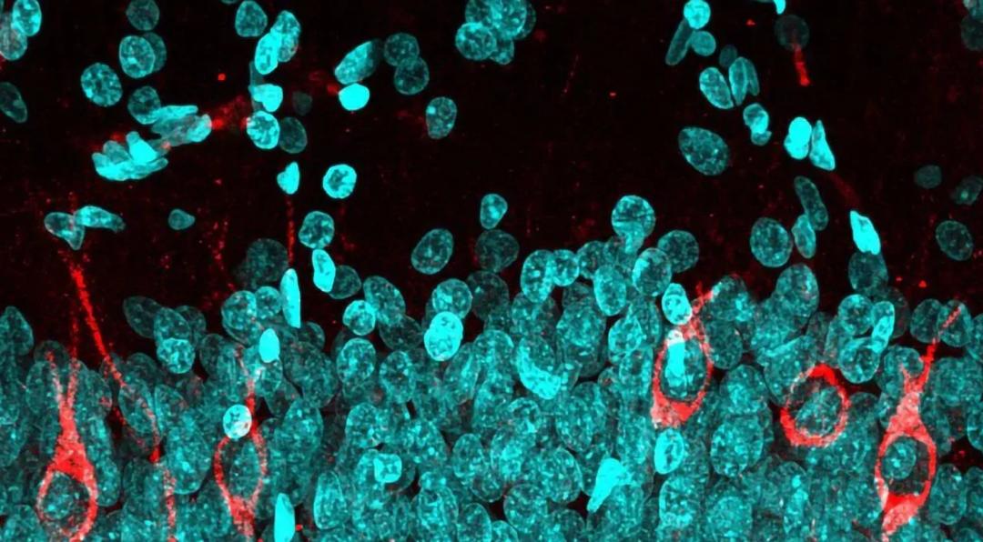 在人步入老年时,海马体内仍能产生新的神经元(图中以红色表示)图源:文献[9]