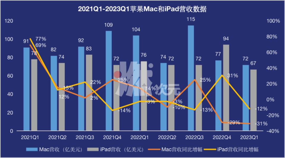 2023年第一季度,苹果Mac和Ipad营收分别为72亿美元和67亿美元,分别同比下跌31%和13%。两位“青铜队友”大幅度的同比下降抵消了iPhone这位“王者”的逆势增长。