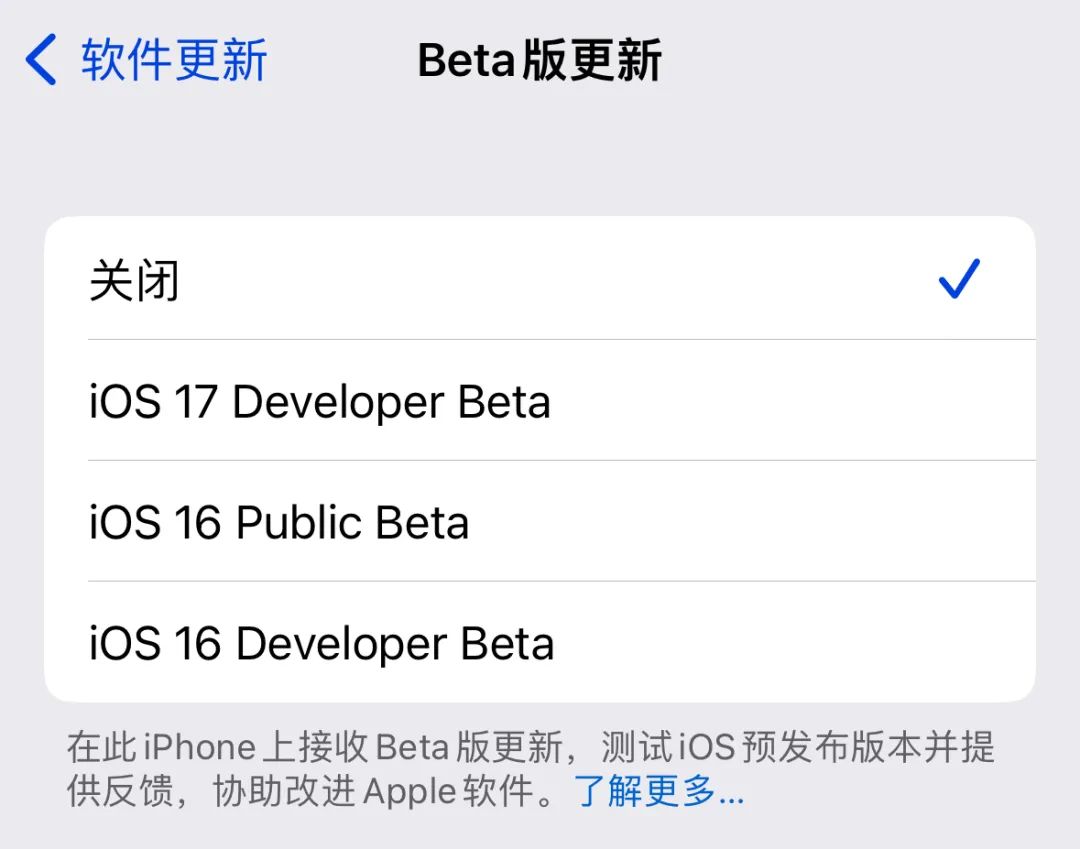 然后再回到 “ 设置——通用——软件更新 ” 多刷新几遍,你就能在 “ Beta 版更新 ” 中找到 iOS/iPadOS 17 的更新选项了。