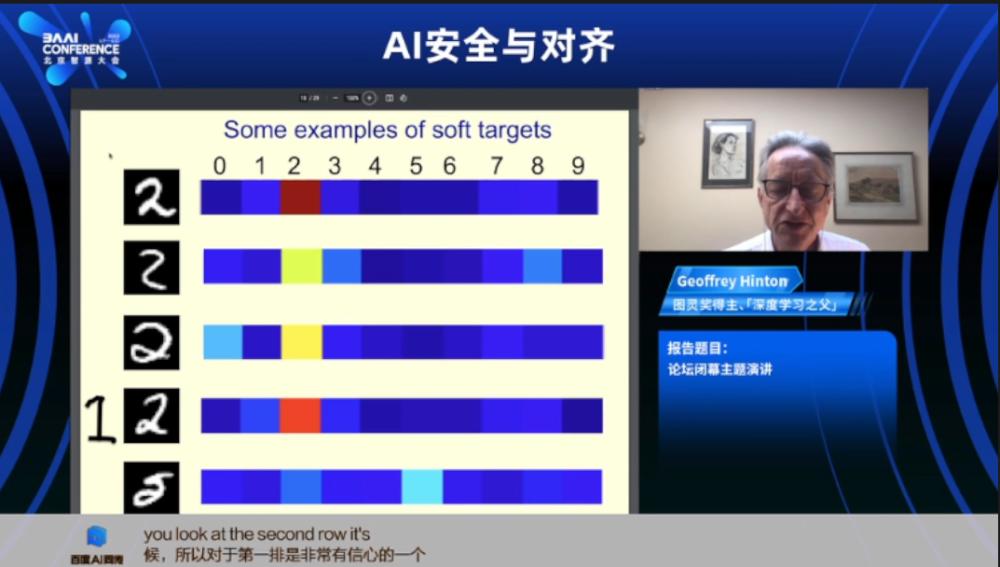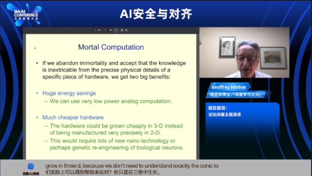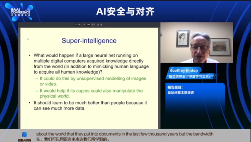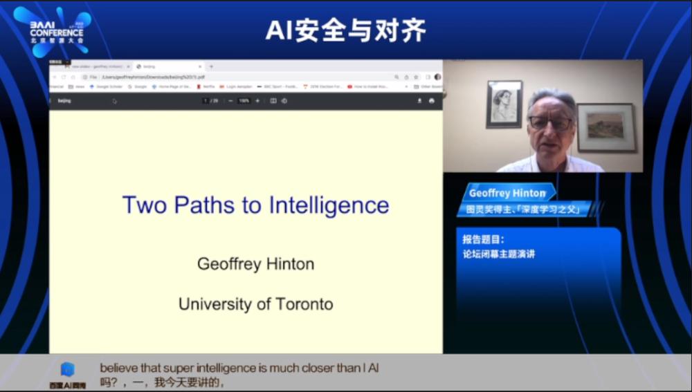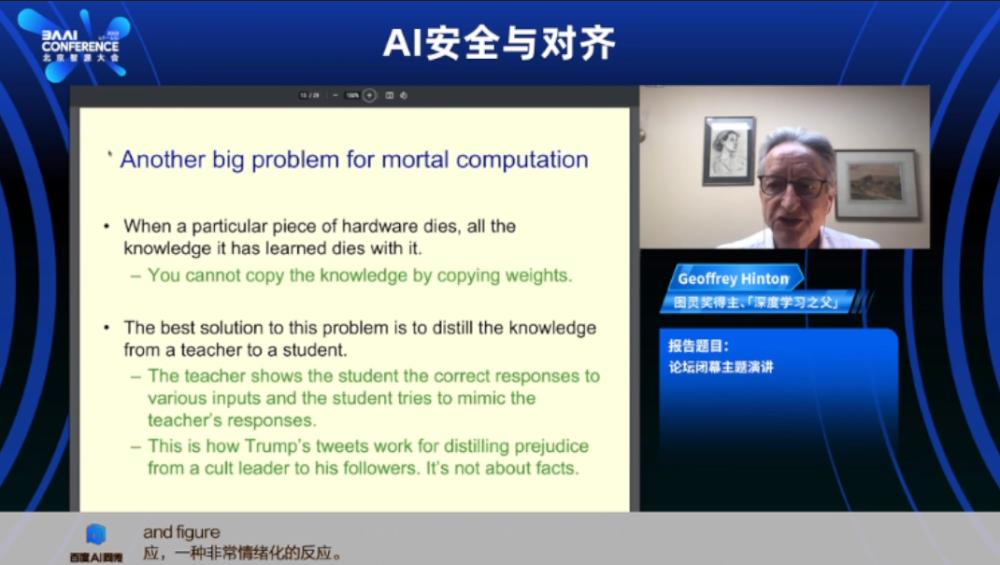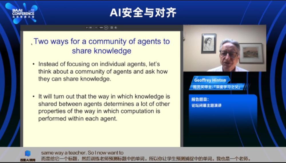 6月10日,辛顿出席被称之为中国“AI春晚”的2023年智源大会,线上发表题为《通向智能的两条通路》(Two paths to Intelligence)的主题演讲,作为大会的压轴闭幕演讲。他在其中讨论了一种新的基于硬件的有限计算,以限制他认为人工智能无限复制可能带来的威胁,但整体上他依然认为AI的能力会很快超越人类,由此带来更大的威胁。