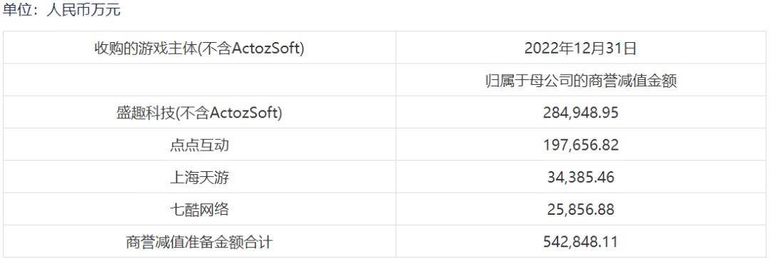 世纪华通可以说是2022年业绩最为惨淡的上市游戏公司,亏损额惊人地来到了70亿元。巨额亏损大部分源于它对游戏业务资产组计提商誉减值准备,除了ActozSoft(盛趣于韩国独立上市、独立运营的控股子公司)未受波及,其他收购而来的游戏子公司基本囊括在内。该笔减值金额合计54亿元,官方称系游戏业务分部业绩未达预期,也因此被监管层要求公开这些公司近三年的盈利情况。