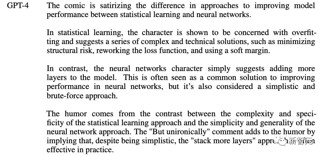 GPT-4一针见血地点出,这副漫画讽刺了统计学习和神经网络在提高模型性能方法上的差异。