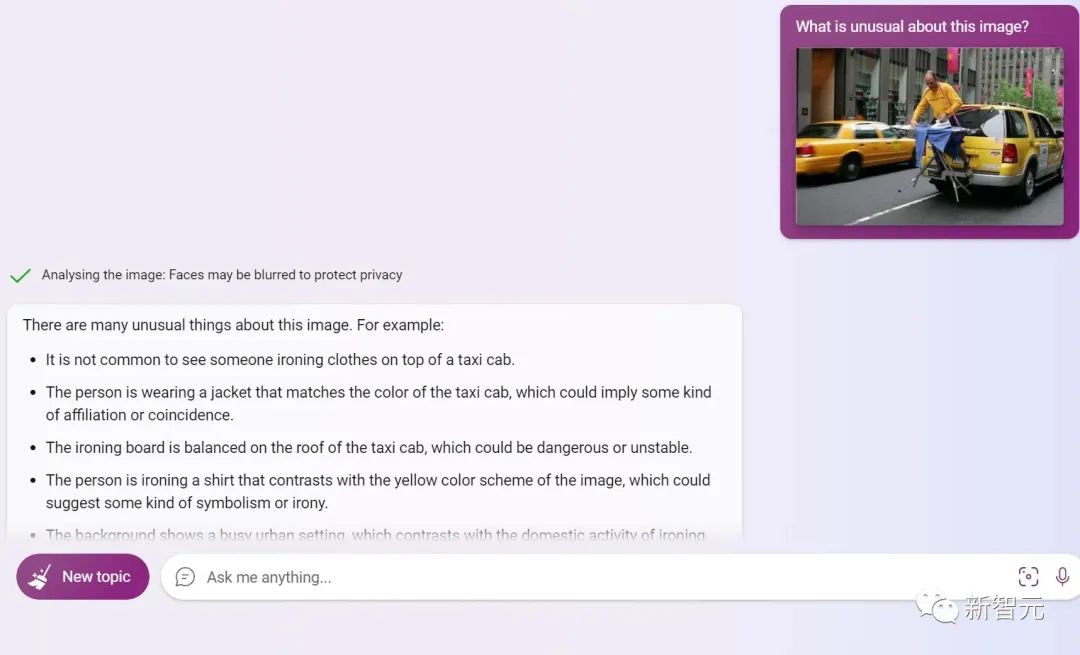 Bing表示,这图里不同寻常的部分太多了。首先,在出租车上熨衣服很离谱,其次,男人穿的衣服和出租车颜色一致,是不是在暗示什么?或者是某种巧合?