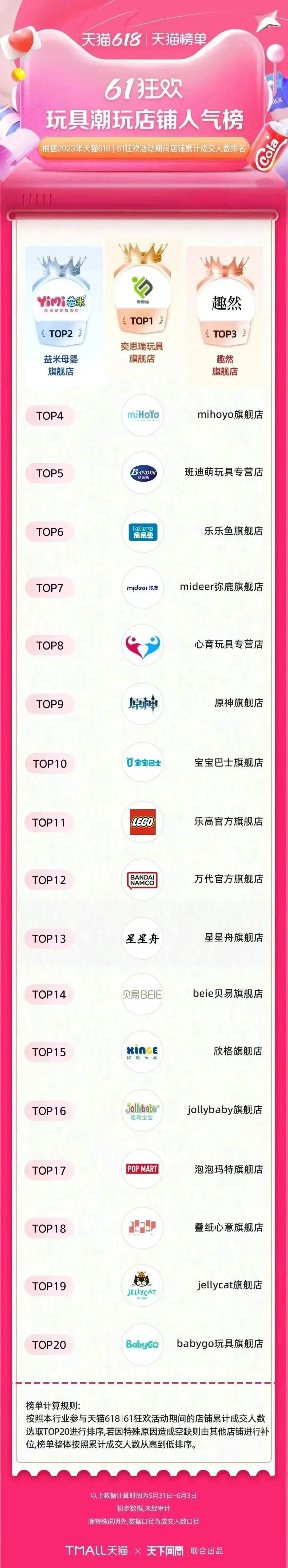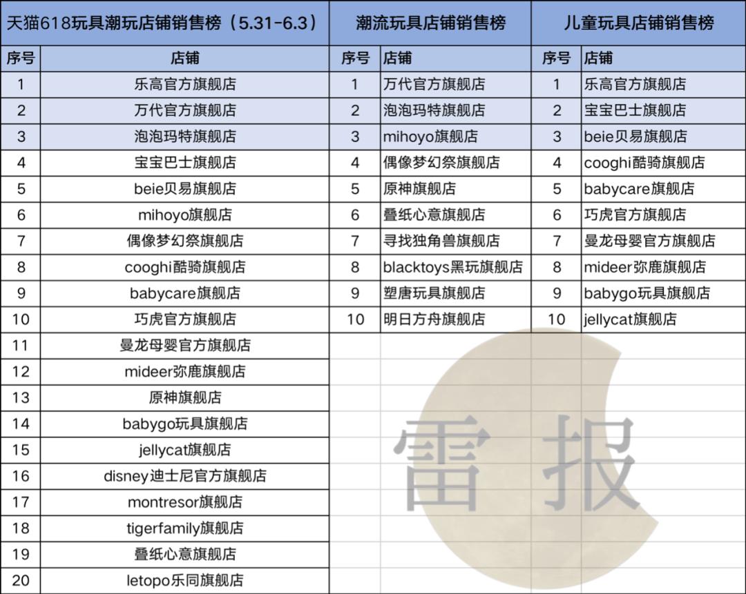 到了6月5日,5.31-6.3的真正意义上的第一波销售榜单出炉。天猫联合天下网商对玩具潮玩店铺销售TOP20、潮流玩具店铺和儿童玩具店铺销售TOP10(品牌支付GMV)分别进行了统计发布。
