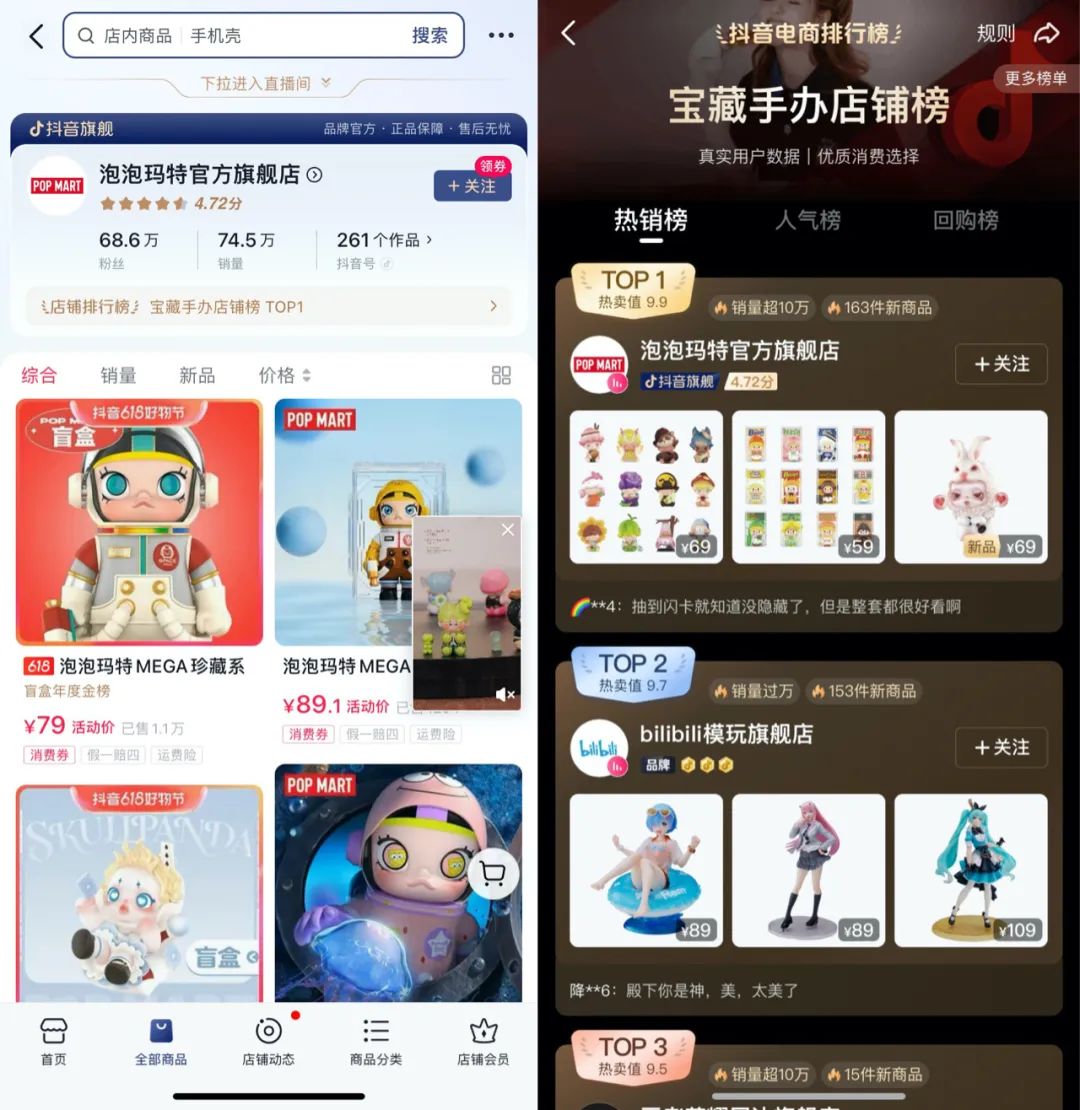 在抖音宝藏手办店铺榜中,泡泡玛特以绝对优势位列第一、排名依次往后分别是bilibili模玩旗舰店、王者荣耀周边旗舰店、玩具城市旗舰店、甜想TimeShare旗舰店、英雄联盟官方旗舰店、以及52TOYS官方旗舰店等,在TOP11-20中,还有模言工社、COME4ARTS、GSC、东映动画、TOPTOY模玩等店铺上榜,均显示销量过万。可见潮玩行业正深度进入抖音,同时不少头部品牌也有较好表现。