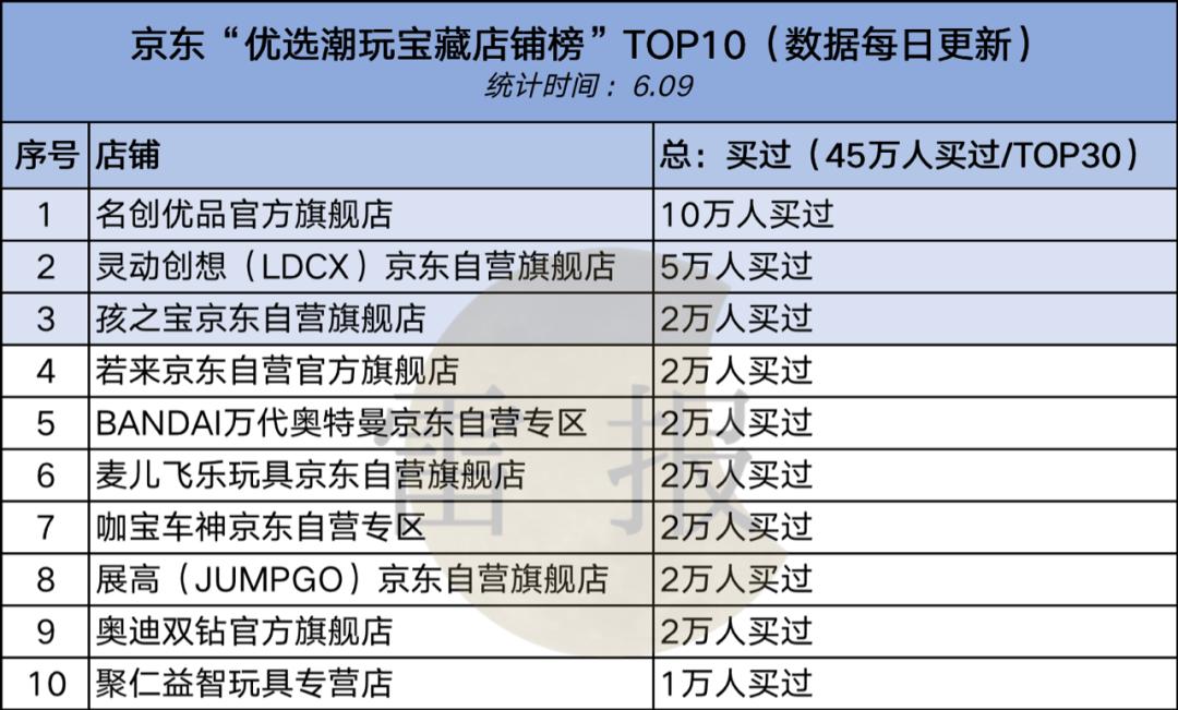 再来看京东,在截止6月1日24时的数据中,其提到平台早教启智玩具增长10倍;乐高成交额同比增长50%等相关数据。6月9日,我们统计平台潮玩相关榜单,涉及“潮流盲盒店铺榜”、“优选潮玩宝藏店铺榜”、以及“手办潮玩店铺榜”的TOP10。首先总体来看,“优选潮玩宝藏店铺榜”TOP30中买过的人是最多的,达到45万,其中名创优品官方旗舰店位列第一,有10万人买过。灵动创想位列第2,孩之宝位列第3,两家店铺买过的人均过万;还有若来、万代、咖宝车神等品牌、IP店铺进入TOP10的榜单。