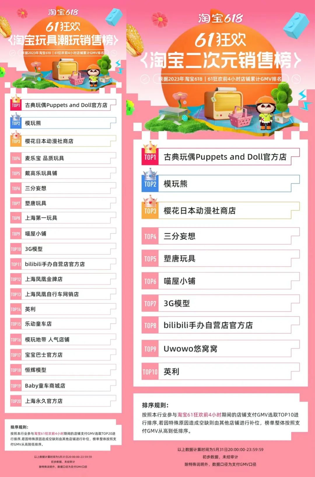 首先,在今年淘宝618开启的第一波销售热潮中,在玩具潮玩板块,前4小时店铺支付GMV排名TOP20中,是主要销售Lolita、模玩、日版动漫周边等产品的店铺位列前三,品牌分别是古典玩偶、模玩熊、樱花日本动漫社。TOP4-20中,还有积木、cos服、模型、手办、周边等相关店铺上榜。值得一提的是其中还有不少儿童玩具、用品品牌店铺上榜,如宝宝巴士等,总体占到不小的比重。