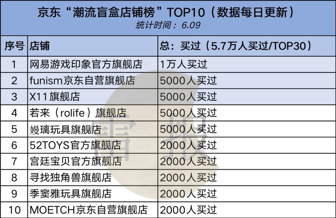 盲盒相关店铺榜,前30店铺,买过的人为5.7万,网易游戏相关店铺排名第一。排名第二的funism京东自营旗舰店目前有斗罗大陆、宝可梦等IP周边在热售,位列第三的是潮流集合店品牌X11,两家店铺均显示有5000人买过。此外若来、52TOYS、寻找独角兽等知名盲盒品牌店铺进入了榜单TOP10。