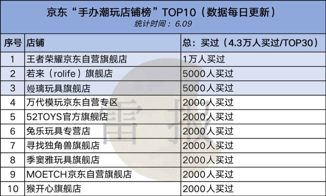 潮流玩具店铺榜第4-10分别是偶像梦幻祭、原神、叠纸心意、寻找独角兽、blacktoys黑玩、塑唐玩具、明日方舟等旗舰店。