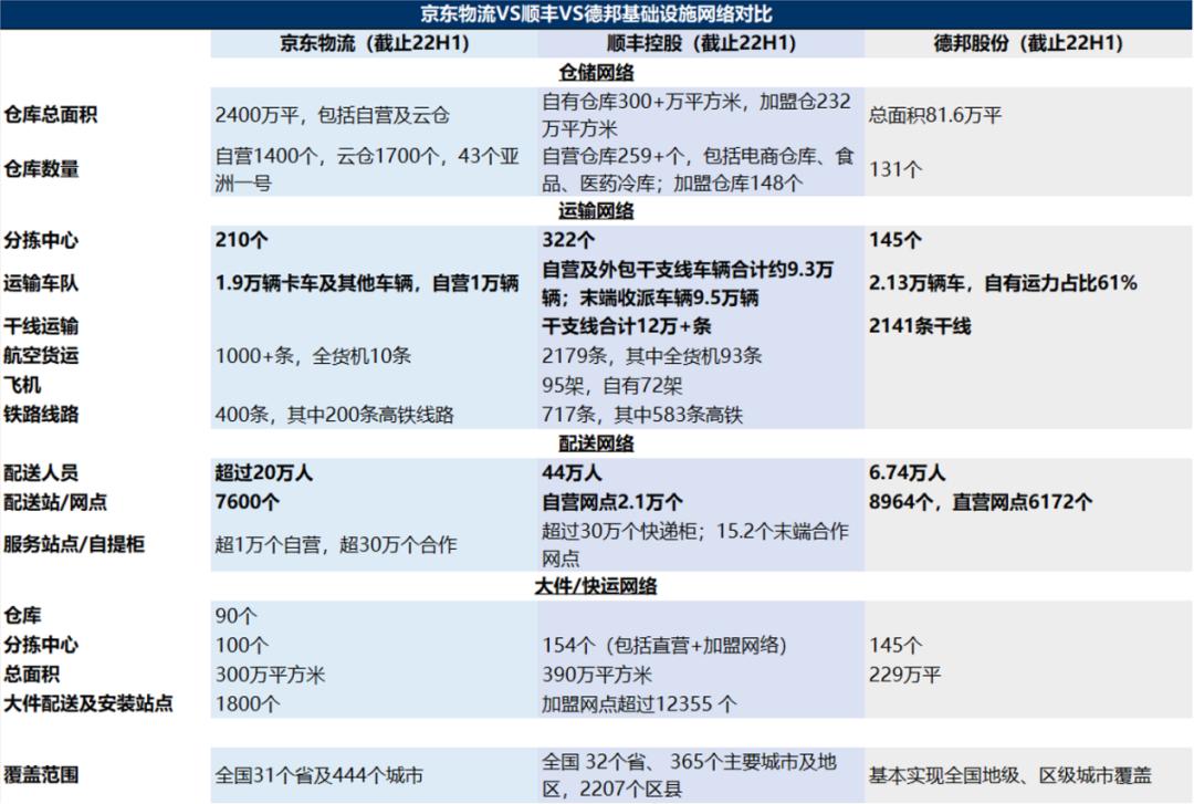 而且为持续争抢大件物流市场份额,京东、顺丰、德邦在过去几年不断完善基础设施建设。截至2022年上半年,京东、顺丰、德邦的配送人员分别为20万人以上、44万人、6.74万人。当然,这些企业高投入的背后,侧面也说明大件物流本身就是一项重资产业务。