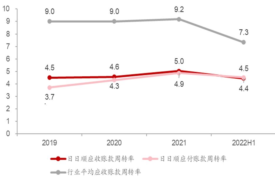 而在报告期,日日顺应收账款周转率分别为4.57、5.04和4.49,这一数值也高于行业均值。但需要指出的是,若日日顺客户财务状况受宏观经济、行业发展等因素影响发生不利变化,回款速度放缓,可能会给日日顺经营状况带来不利影响,尤其是对公司的现金流运作提出了更高的要求。