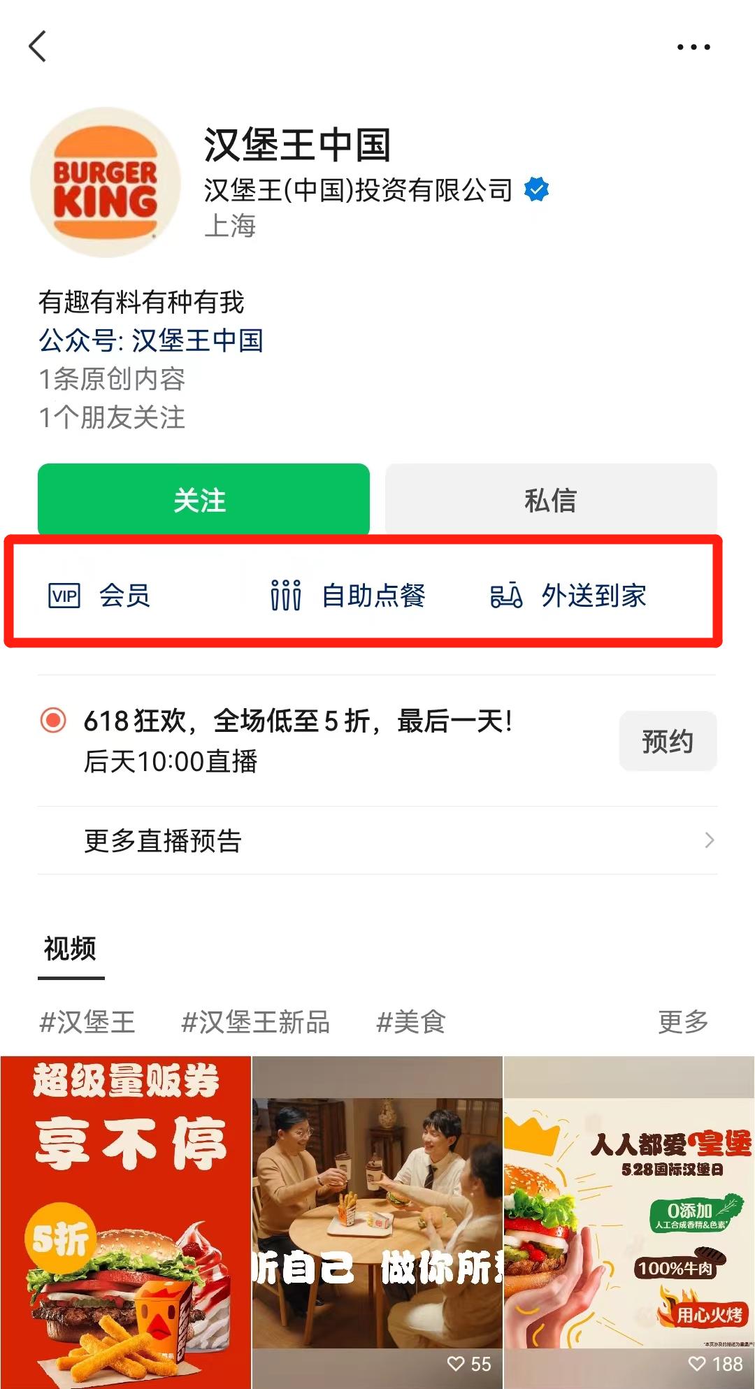 以商家汉堡王为例,其视频号主页下,新增的本地生活组件可分为:会员、自助点餐、外送到家。