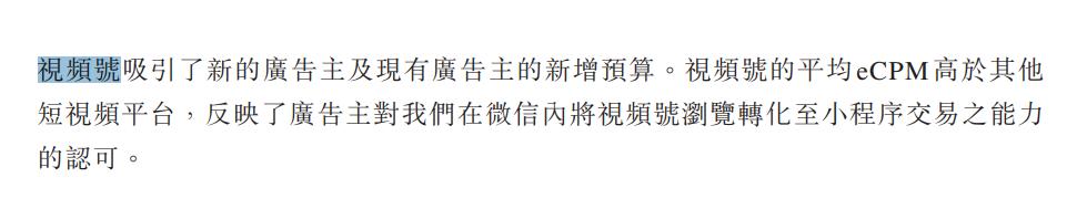 根据腾讯最新财报显示,视频号平均ECPM高于其他短视频平台,吸引了新的广告主与现有广告主的新增预算;微信广告占了腾讯整个广告收入一半以上,其中,视频号的收入不断增长。
