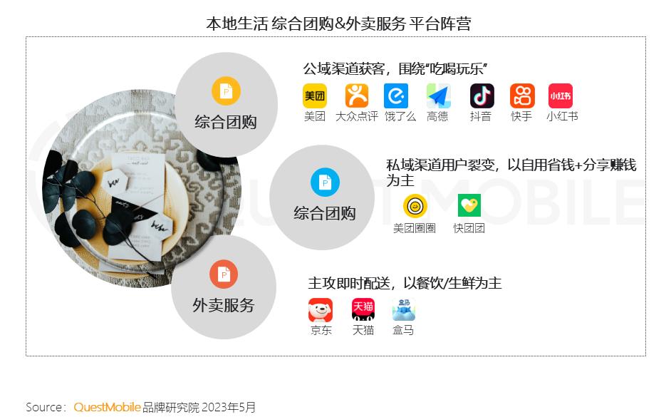 综合团购玩 家众多,有美团、大众点评、饿了么、高德、抖音、快手和小红书。